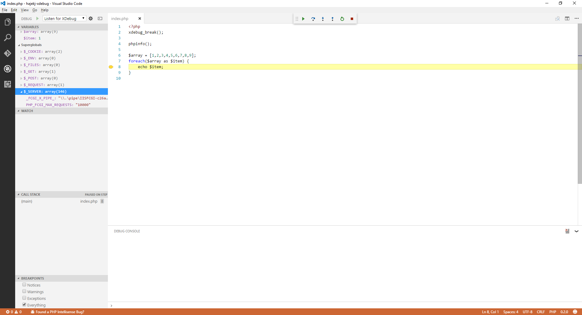 Long story short, after some time, I discovered Xdebug which allowed me to debug PHP in a quite decent manner. In combination with Visual Studio Code and PHP Debug extension this became super easy (I will probably make a separate post on the combination of PHP and VS Code).