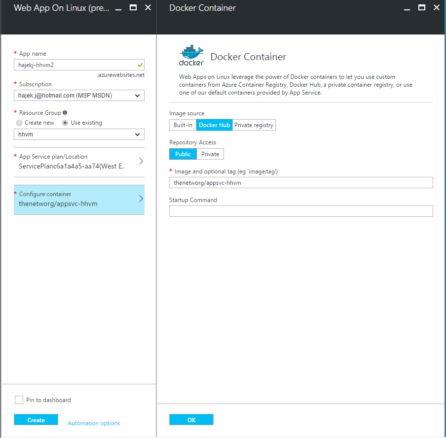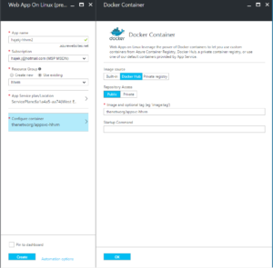 The process is very simple - in Azure Portal you create a new resource - Web App on Linux and specify the image name you published to Docker Hub like so: